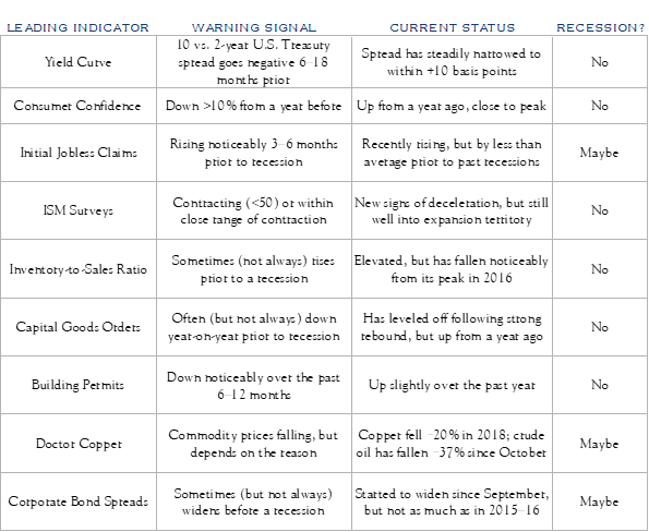 But is that really the case? Nine leading indicators that frequently flash warning signals of a coming recession suggest that the market’s reaction is premature. The U.S. economy is slowing, from its peak earlier this year, and may slow further, but still appears to have some ways to go before its positive momentum turns negative. Just as we cautioned against excessive exuberance six months ago, noting that we had entered a mature stage of the market cycle, we now caution against excessive despair, and advise investors to keep their eyes on the historically attractive longer-term rewards likely to accrue to those with the capacity and stomach to ride out the cycle.