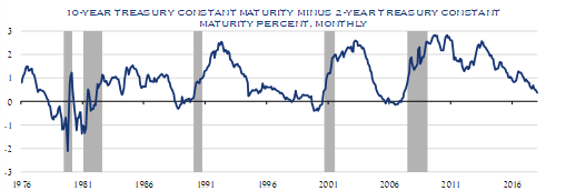 Historically, one of the most reliable indicators of a coming recession is an inverted yield curve, where long-term interest rates on bonds fall below short-term rates. That’s why markets have paid close attention as the spread between the 2 and 10-year U.S. Treasury rates has steadily narrowed to just 33 basis points, its lowest since mid-2005. A number of global bond indices are actually showing an inverted curve (a negative spread) for the first time since 2007. The unequal weighting of these indices—heavier U.S. on the short end, lighter on the long end—may be causing them to overstate the case a bit, since no individual country’s yield curve has inverted, yet. But if the Fed hikes its Funds rate one or two more times (as expected this year), and longer-term rates stay stuck where they are, the spread could turn negative.