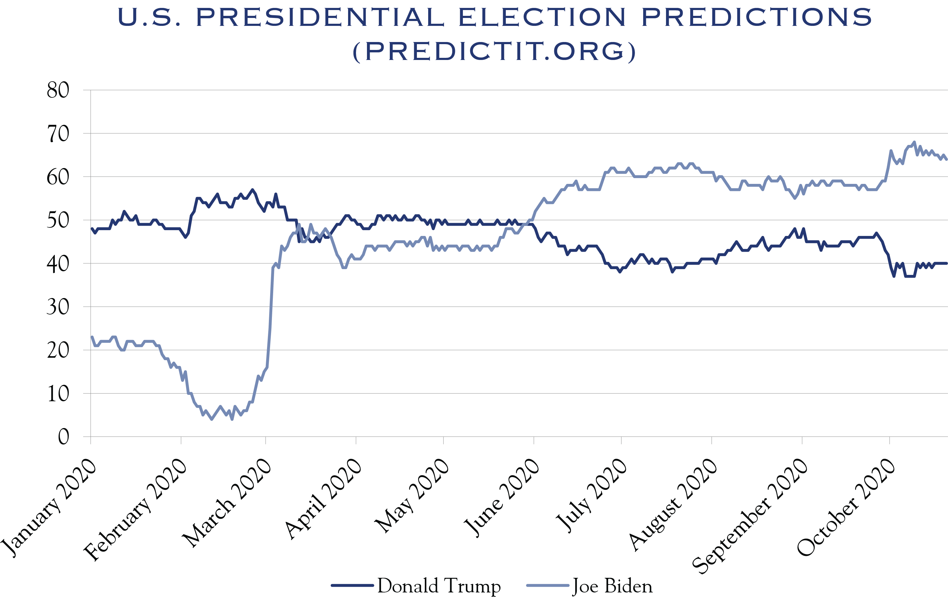 Given the twists and turns of the year, the imperfect nature of polls, and the new influence of a projected massive increase in mail-in voting, some anticipate a tumultuous conclusion to the election. This possibility is reflected by options pricing for the volatility index. In essence, investors are willing to pay more than usual amounts for risk protection in the period immediately following the election. Despite the polls and prediction sites moving strongly towards Biden, this premium for protection remains.