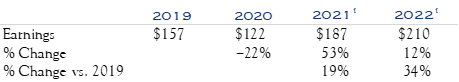 Our earnings forecast is based on continued economic growth at or above trend levels through 2022, combined with the persistence of elevated margins. We currently project $200–210 in earnings, coinciding with consensus expectations.