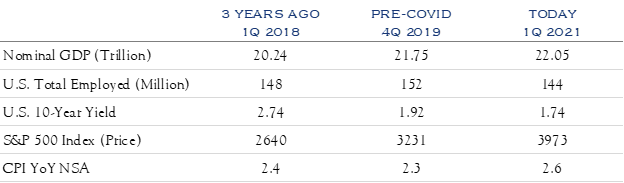 The important jobs report number on May 7th showed job creation (or recovery) of 266,000 jobs in the month of April. This was well below expectations for 1,000,000 jobs to have been created, despite large numbers of job openings and some employers reporting difficulty finding workers. There are several factors at play. Closures or limitations of schools and childcare beget constraints for some employees to return to work. Others are reluctant to return to work due to lingering health concerns. Job transition issues may persist as some jobs never return, while new jobs are created in different fields. The stimulus payments and extended unemployment benefits also have some unintended consequences. About 30% of the jobs lost to the pandemic are in the leisure and hospitality segment. These jobs carry an average hourly wage of around $18—a level comparable to many enhanced unemployment benefit packages. Nonetheless, we believe the job market will continue to improve as economic activity normalizes and the challenges surrounding the pool of available labor begin to ebb.