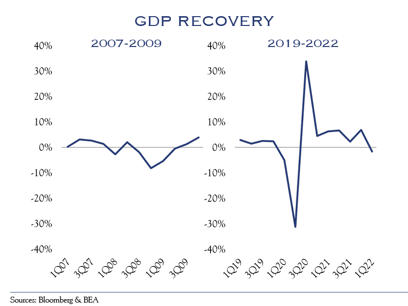 The first quarter presents a clear example of how GDP calculations may over-emphasize economic troubles. Just as companies grew earnings during a quarter of real negative growth, earnings estimates for the rest of 2022 remain robust. At the dawn of 2022, analysts estimated S&P 500 earnings at $220 for the year. Today—following the winter COVID wave, inflation, war, and continued supply-chain problems—estimates stand at $229.