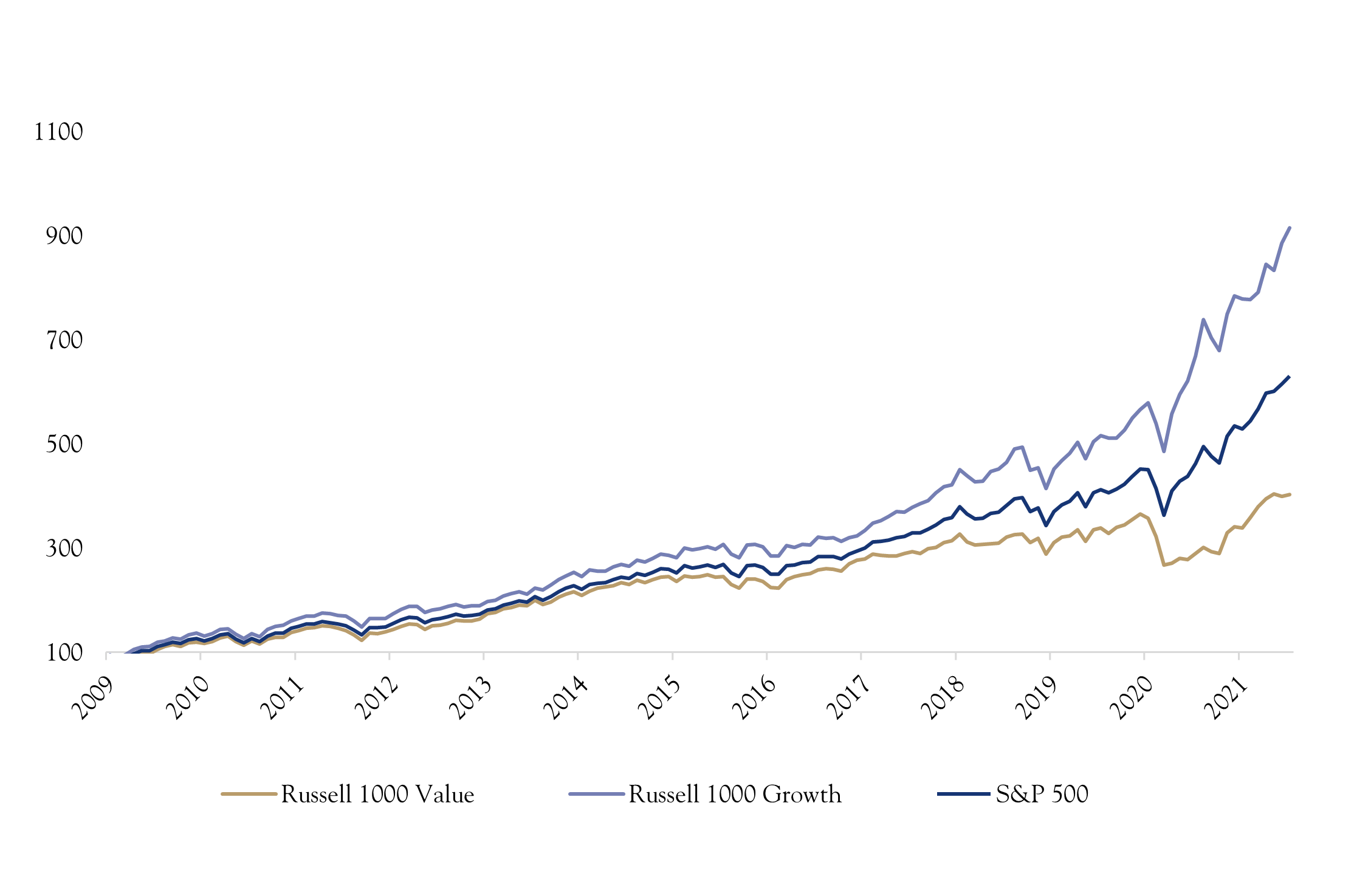 It is widely understood that the last decade was quite prosperous for Growth investing and conversely challenging for Value investing. The Great Recession inflicted deep and lasting scars on the U.S. and global economy. In fact, the ensuing recovery was one of the weakest economic recoveries on record, with real GDP (annually on average) growing at approximately half the rate experienced in prior non-recessionary periods in the post-WWII era: 2.3% vs. 4.1% going back to 1948. As a result of the damage, central banks around the world, including the United States Federal Reserve, resorted to extreme and unconventional monetary policy tools which had the effect of keeping interest rates extraordinarily low (even negative in some cases) and market liquidity high. The combined effect of scarce growth and sustained, abundant monetary policy primarily benefitted financial assets broadly and Growth stocks particularly. More speculative “long duration” stocks, those with earnings and cash flow visibility far out into the future, were the biggest beneficiaries. As seen in the following chart, for the period between December 31, 2009 and December 31, 2020, the Russell 1000 Growth Index return handily exceeded the S&P 500 and more than doubled the return of the Russell 1000 Value Index. Interestingly, this period includes the recession and bear market resulting from the pandemic, which merely accelerated the trend already in place. Momentum stocks, particularly those with exposure to secular trends accelerated by the pandemic, such as “work and learn from home stocks” thrived during 2020.
