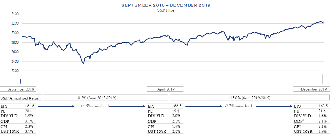 Considering the 29% return for the S&P 500 in 2019, we note that 17% of the gain merely advanced values to their level as of September/October 2018, while the remaining 12% represented primarily an advance in valuation as measured by PE, perhaps in anticipation of an improving economy and earnings picture. Alternately, one could make the case that the mere lowering of volume on numerous macro issues—Fed rate posture, tariffs, etc.—improves the valuation picture. The whole episode highlights the somewhat arbitrary nature of the calendar year as a yardstick for how stocks have performed. While many hew to the calendar year with annual market predications or avoid the exercise entirely by forecasting over 7–10 years, we stick with a three-year time horizon—splitting the difference between tactical and strategic outlooks. We note that each year seems to bring information that is more readily and travels more quickly than ever before. 2019 was no exception. 2020 is likely to be even more emblematic of this issue, particularly as the U.S. presidential campaign gets in full swing.