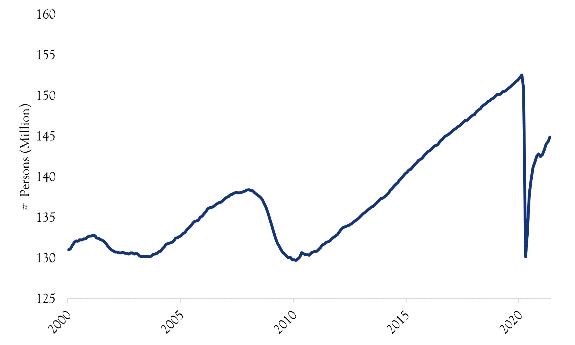 - The COVID decline in employment has not been re-captured, despite the economy largely recovering